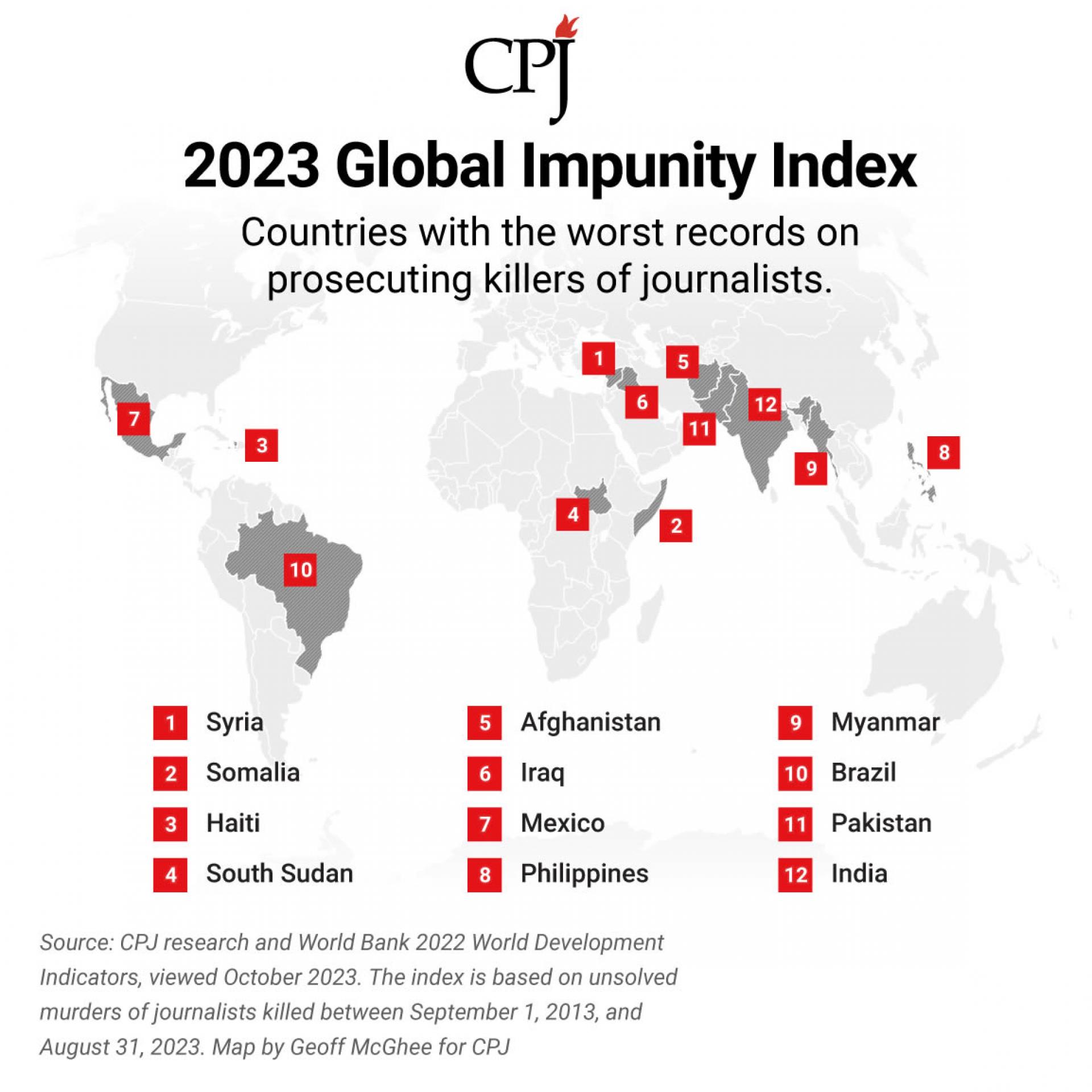 El índice solo muestra naciones con cinco o más casos no resueltos, pero en la página web hay detalles sobre todos los países del mundo desde 1992. Países como Omán y Guyana no tienen periodistas muertos ni desaparecidos en su línea de trabajo. Obviamente, el número de muertos no siempre refleja el peligro que enfrentan los periodistas. Por ejemplo, en México el número de muertos no resueltos ha disminuido desde 13 en 2022 a 2 en 2023, pero sigue siendo uno de los países más arriesgados del mundo para los periodistas, debido a ataques no letales como el acoso, amenazas y abducción.
